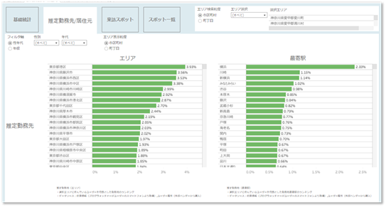 エリナレでは、3種類のデータを掛け合わせて多角的な分析が可能です。①基礎統計データ:政府系のオープンデータを活用し、エリアごとの人口構成・年収・世帯構成・施設分布を把握。②位置情報データ:居住地・勤務先・移動傾向・来訪スポットを分析し、居住者の動線・嗜好・行動特性を可視化。③SUUMOデータ:10年分の掲載・反響・賃料推移データから、エリア別需給バランス・賃料相場・反響シェアを分析可能。これにより、「どの層がどのエリアに住み、どんな物件を求めているか」を一目で把握できます。