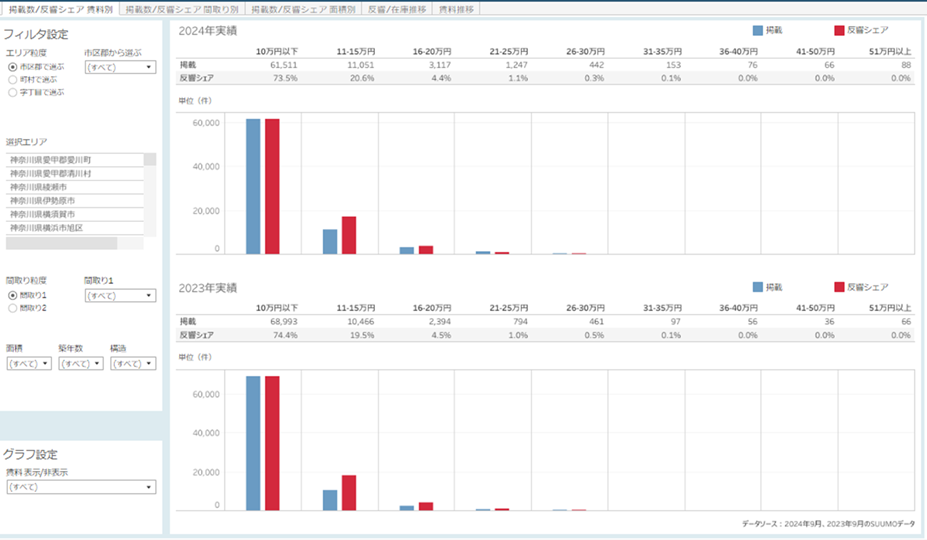 エリナレは、位置情報データとSUUMOのビッグデータを掛け合わせたエリアマーケティング支援サービスです。国勢調査などの政府系オープンデータに加え、国内最大級の人流データと、SUUMOに蓄積された10年分の掲載・反響データを統合。これらをTableau Cloud上のダッシュボードで一元的に分析・可視化できます。エリアの需要動向やターゲット層を可視化し、物件企画・賃料設定・広告戦略までデータドリブンな提案を実現します。